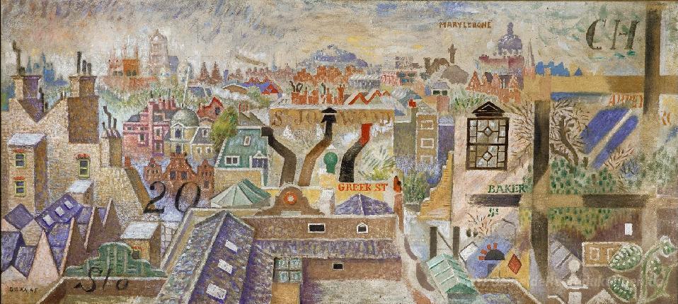Wir bieten Ihnen eine handgefertigte Reproduktion auf Leinwand des berühmten Kunstwerks 'London Dächer I' von Nikos Hadjikyriakos-Ghikas, aus dem Reproduktionsmuseum.