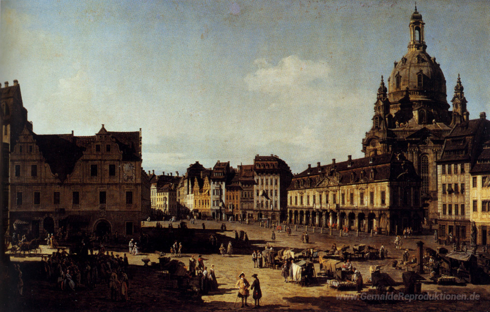 Wir bieten Ihnen eine handgefertigte Reproduktion auf Leinwand des berühmten Kunstwerks 'Mit Blick auf das New Market Place in Dresden von der Moritz' von Bernardo Bellotto, aus dem Reproduktionsmuseum.