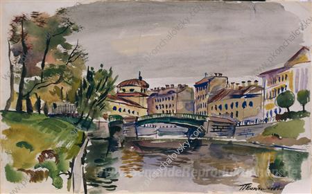 Wir bieten Ihnen eine handgefertigte Reproduktion auf Leinwand des berühmten Kunstwerks 'Moika. Dreibogenbrücke.' von Pyotr Konchalovsky, aus dem Reproduktionsmuseum.