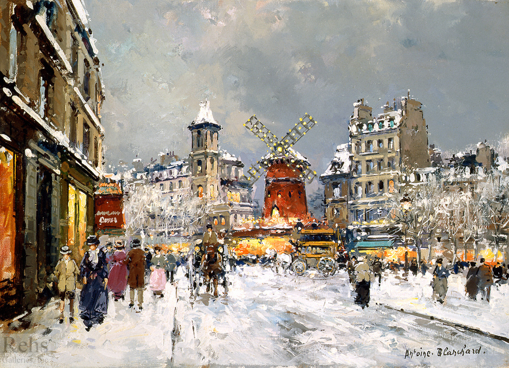 Wir bieten Ihnen eine handgefertigte Reproduktion auf Leinwand des berühmten Kunstwerks 'Moulin Rouge, ein pigalle sous la neige' von Antoine Blanchard, aus dem Reproduktionsmuseum.