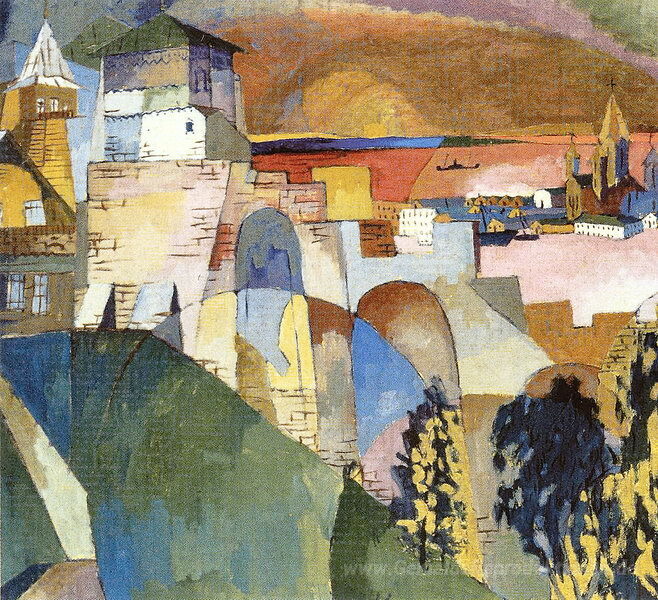 Wir bieten Ihnen eine handgefertigte Reproduktion auf Leinwand des berühmten Kunstwerks 'Nizhny Novgorod' von Aristarkh Lentulov, aus dem Reproduktionsmuseum.