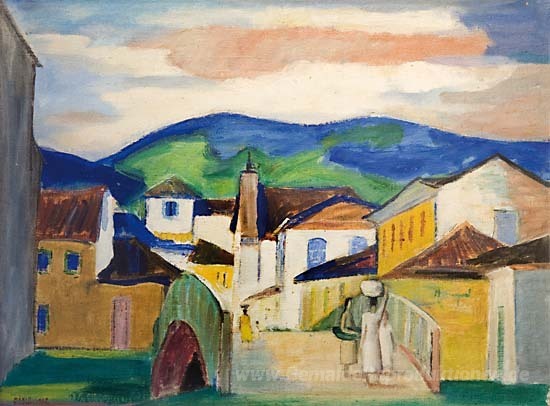 Wir bieten Ihnen eine handgefertigte Reproduktion auf Leinwand des berühmten Kunstwerks 'Paisagem com ponte' von Mario Zanini, aus dem Reproduktionsmuseum.
