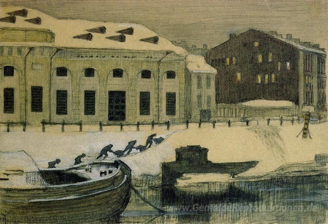 Wir bieten Ihnen eine handgefertigte Reproduktion auf Leinwand des berühmten Kunstwerks 'Petersburg. Die Obvodny Canal.' von Mstislav Dobuzhinsky, aus dem Reproduktionsmuseum.