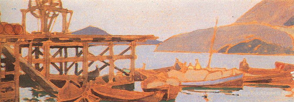 Wir bieten Ihnen eine handgefertigte Reproduktion auf Leinwand des berühmten Kunstwerks 'Pier in der Fabrik in Murmansk' von Konstantin Korovin, aus dem Reproduktionsmuseum.