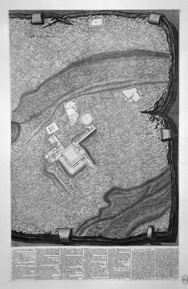 Wir bieten Ihnen eine handgefertigte Reproduktion auf Leinwand des berühmten Kunstwerks 'Plan der bestehenden Fabriken in der Villa Adriana, mit einer Wi' von Giovanni Battista Piranesi, aus dem Reproduktionsmuseum.