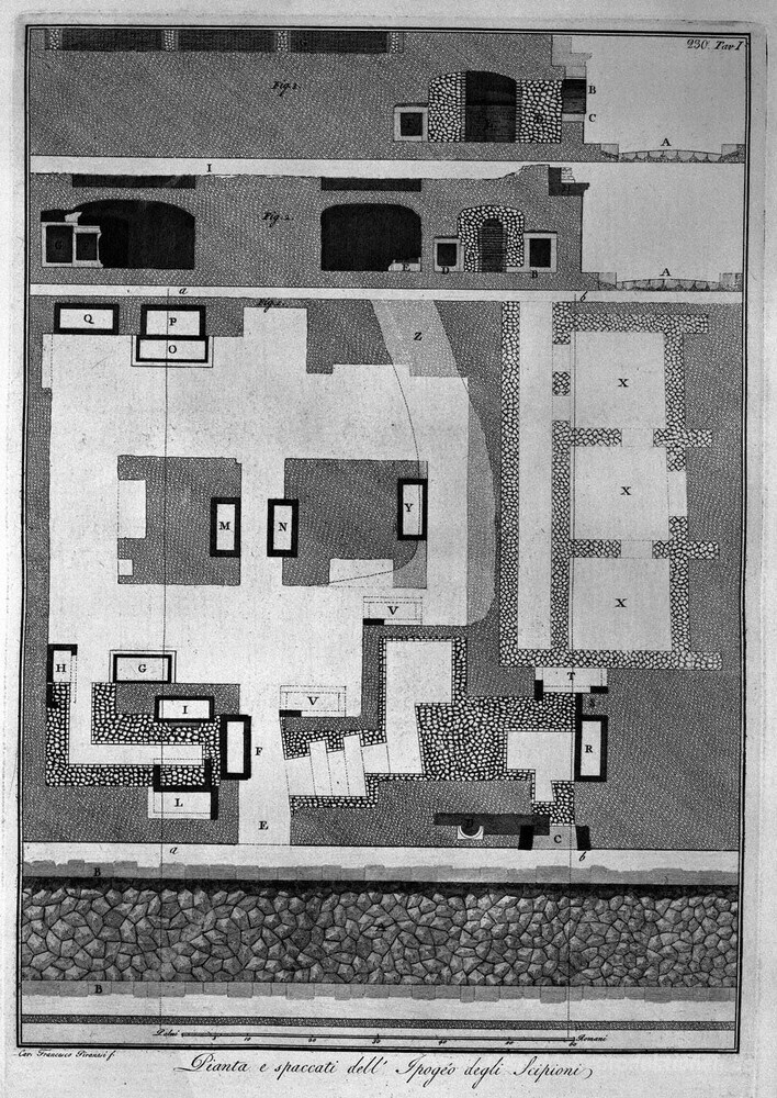 Wir bieten Ihnen eine handgefertigte Reproduktion auf Leinwand des berühmten Kunstwerks 'Planen und Abschnitte des Hypogäum der Scipionen' von Giovanni Battista Piranesi, aus dem Reproduktionsmuseum.