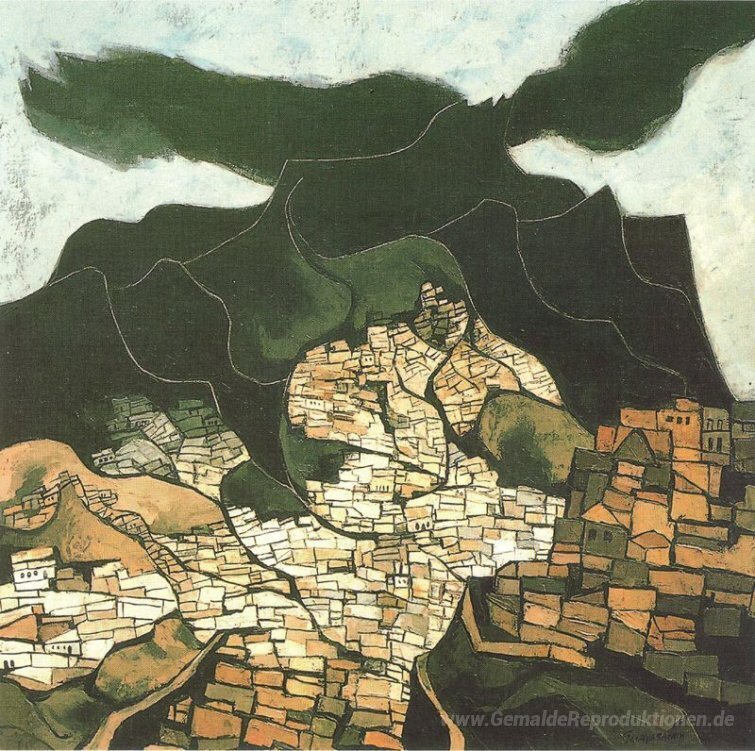Wir bieten Ihnen eine handgefertigte Reproduktion auf Leinwand des berühmten Kunstwerks 'Quito de la Nube negra' von Oswaldo Guayasamin, aus dem Reproduktionsmuseum.