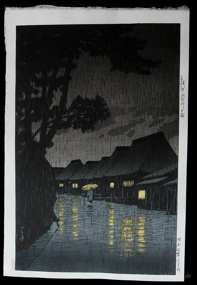 Willkommen in unserer exquisiten Kollektion von Ölgemälden, wo Kunst und Atmosphäre auf harmonische Weise zusammentreffen. Jedes Kunstwerk ist nicht nur ein visuelles Erlebnis, sondern auch ein Teil einer tiefen künstlerischen Tradition. Eines unserer herausragenden Stücke ist Rainy Night in Maekawa, geschaffen von dem renommierten Künstler Hasui Kawase. Dieser Meister des Shin-Hanga-Stils fängt auf eindrucksvolle Weise die ruhige Schönheit des japanischen Lebens ein.