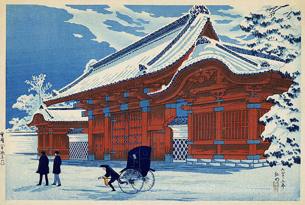 Wir bieten Ihnen eine handgefertigte Reproduktion auf Leinwand des berühmten Kunstwerks 'Red Gate am Hongo' von Shotei Takahashi, aus dem Reproduktionsmuseum.