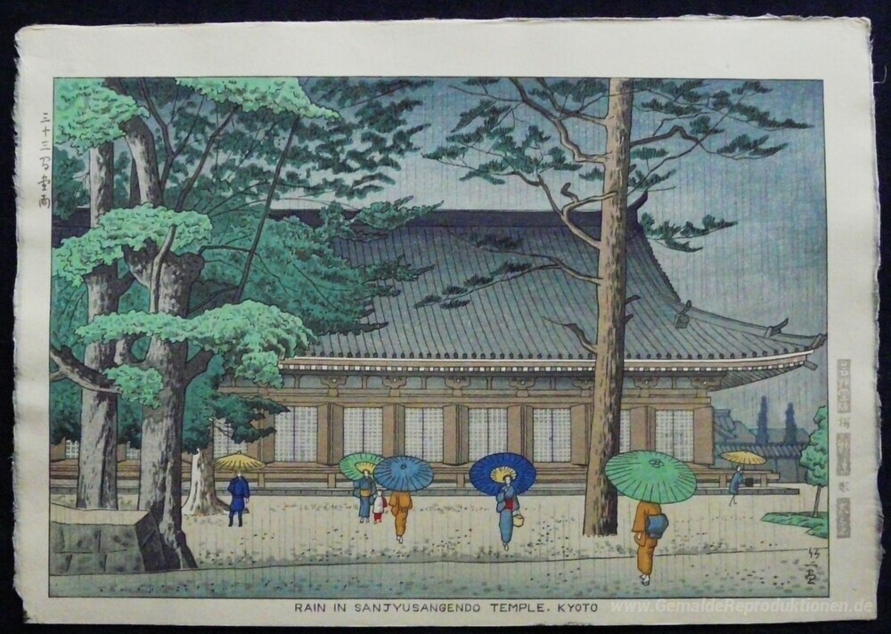 Wir bieten Ihnen eine handgefertigte Reproduktion auf Leinwand des berühmten Kunstwerks 'Regen in Sanjyusangendo Tempel, Kyoto' von Asano Takeji, aus dem Reproduktionsmuseum.