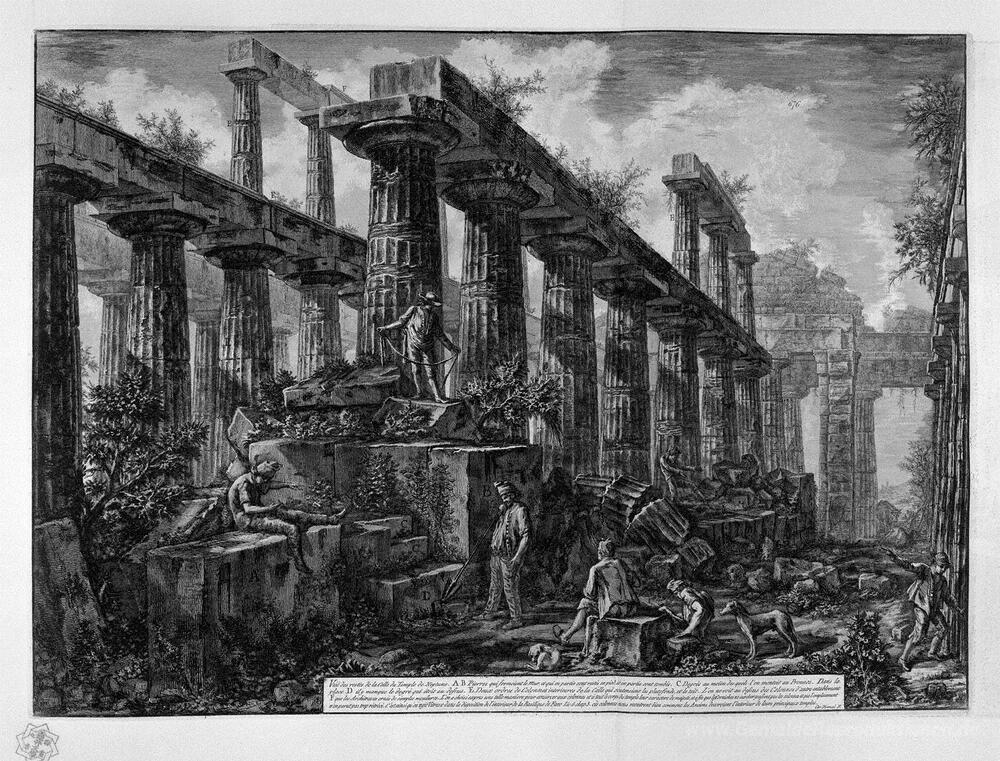 Wir bieten Ihnen eine handgefertigte Reproduktion auf Leinwand des berühmten Kunstwerks 'Reste der Tempel des Neptuns Zell' von Giovanni Battista Piranesi, aus dem Reproduktionsmuseum.