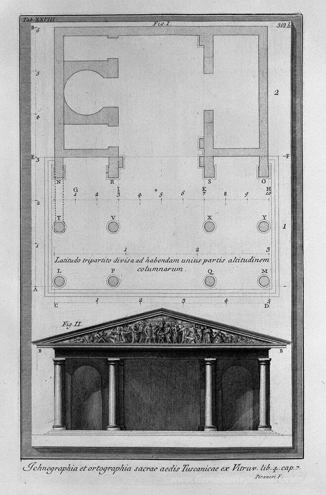 Wir bieten Ihnen eine handgefertigte Reproduktion auf Leinwand des berühmten Kunstwerks 'Riss und Aufriss des zweiten Tempels Tuscan Vitruvius' von Giovanni Battista Piranesi, aus dem Reproduktionsmuseum.