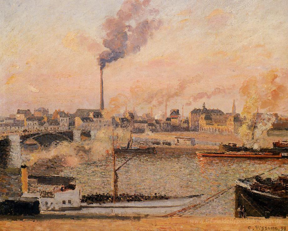 Wir bieten Ihnen eine handgefertigte Reproduktion auf Leinwand des berühmten Kunstwerks 'Saint Sever, Rouen Morgen, fünf Uhr' von Camille Pissarro, aus dem Reproduktionsmuseum.