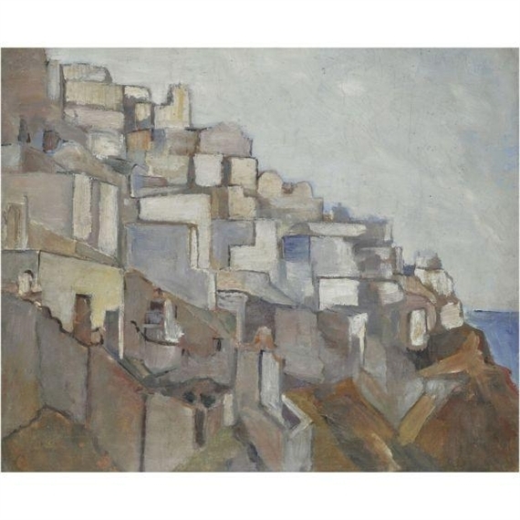 Wir bieten Ihnen eine handgefertigte Reproduktion auf Leinwand des berühmten Kunstwerks 'Santorini' von Theophrastos Triantafyllidis, aus dem Reproduktionsmuseum.
