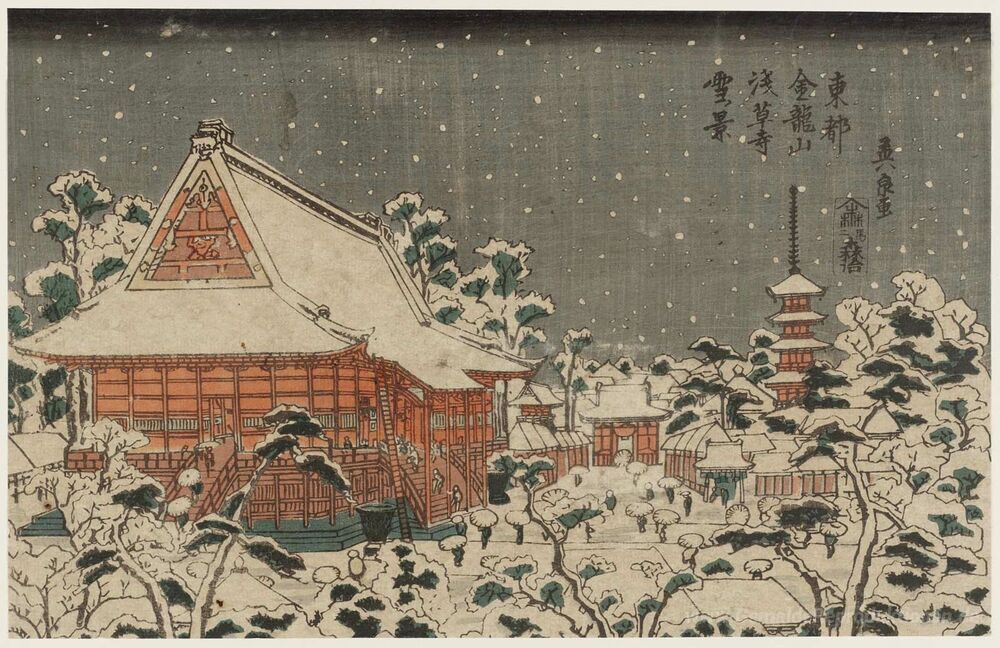 Wir bieten Ihnen eine handgefertigte Reproduktion auf Leinwand des berühmten Kunstwerks 'Schnee-Szene am Senso-ji-Tempel in Kinryuzan in der östlichen Ha' von Keisai Eisen, aus dem Reproduktionsmuseum.