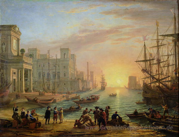Wir bieten Ihnen eine handgefertigte Reproduktion auf Leinwand des berühmten Kunstwerks 'Seaport at Sunset' von Claude Lorrain, aus dem Reproduktionsmuseum.