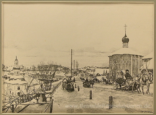 Wir bieten Ihnen eine handgefertigte Reproduktion auf Leinwand des berühmten Kunstwerks 'Sergijew Possad. Die Moskauer Straße' von Konstantin Yuon, aus dem Reproduktionsmuseum.