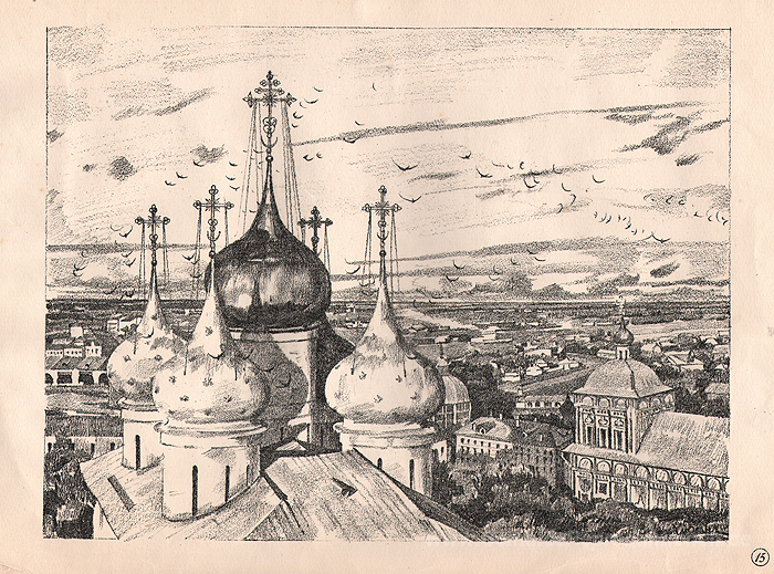 Wir bieten Ihnen eine handgefertigte Reproduktion auf Leinwand des berühmten Kunstwerks 'Sergijew Possad. Domes und Schwalben' von Konstantin Yuon, aus dem Reproduktionsmuseum.