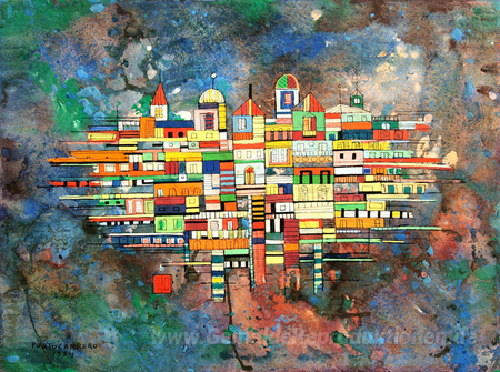 Wir bieten Ihnen eine handgefertigte Reproduktion auf Leinwand des berühmten Kunstwerks 'Stadt' von Rene Portocarrero, aus dem Reproduktionsmuseum.