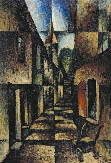 Wir bieten Ihnen eine handgefertigte Reproduktion auf Leinwand des berühmten Kunstwerks 'Straße mit Kirche' von Arthur Segal, aus dem Reproduktionsmuseum.