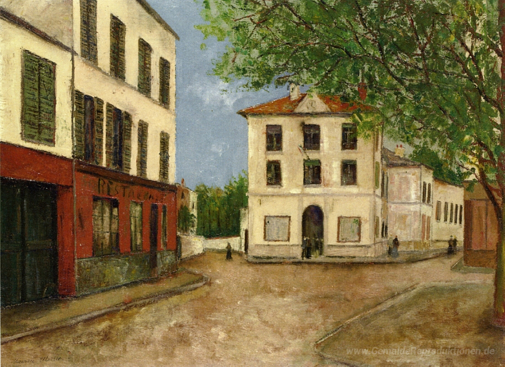 Wir bieten Ihnen eine handgefertigte Reproduktion auf Leinwand des berühmten Kunstwerks 'Street in Nanterre' von Maurice Utrillo, aus dem Reproduktionsmuseum.