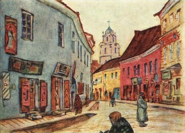 Wir bieten Ihnen eine handgefertigte Reproduktion auf Leinwand des berühmten Kunstwerks 'Street in Wilna' von Mstislav Dobuzhinsky, aus dem Reproduktionsmuseum.