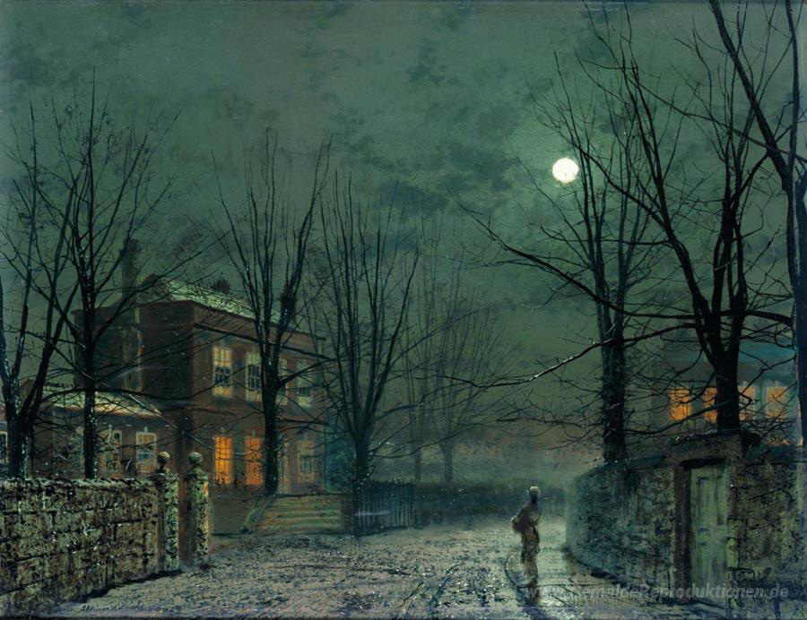 Die technologische Raffinesse von Grimshaws Ölgemälden, kombiniert mit seinem impressionistischen Stil, ermöglicht es, die geheimnisvolle Schönheit der nächtlichen Szenerie zum Leben zu erwecken. The Old Hall Under Mondschein vereint feine Details und lebendige Farben, die harmonisch aufeinander abgestimmt sind, um eine einladende und nostalgische Stimmung zu erzeugen. Mit einem solchen Kunstwerk bereichern Sie nicht nur Ihre Wände, sondern verwandeln auch die gesamte Atmosphäre Ihres Raumes in einen Ort der Inspiration und des Staunens.