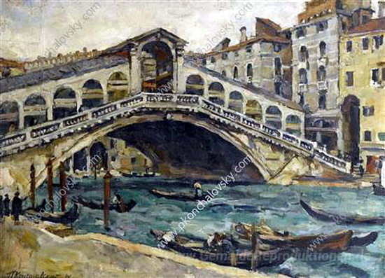 Wir bieten Ihnen eine handgefertigte Reproduktion auf Leinwand des berühmten Kunstwerks 'Venedig. Rialto-Brücke.' von Pyotr Konchalovsky, aus dem Reproduktionsmuseum.