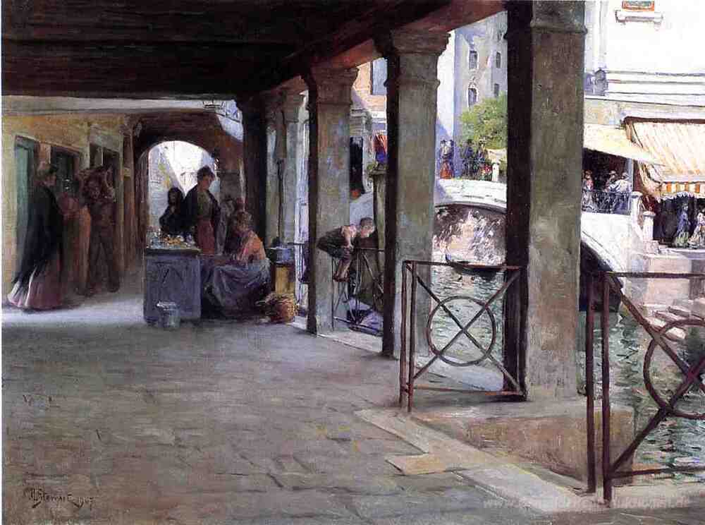 Wir bieten Ihnen eine handgefertigte Reproduktion auf Leinwand des berühmten Kunstwerks 'Venezianischen Markt-Szene' von Julius LeBlanc Stewart, aus dem Reproduktionsmuseum.