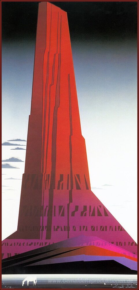 Wir bieten Ihnen eine handgefertigte Reproduktion auf Leinwand des berühmten Kunstwerks 'Wüste Wolkenkratzer' von Eyvind Earle, aus dem Reproduktionsmuseum.