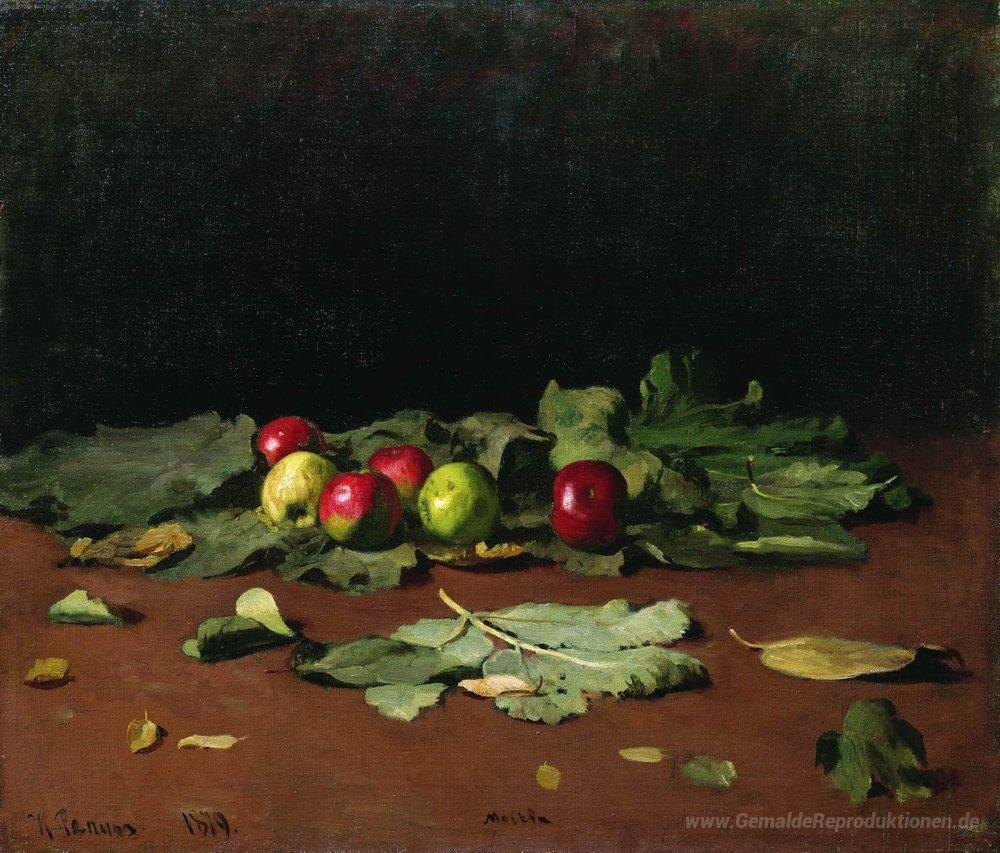 Wir bieten Ihnen eine handgefertigte Reproduktion auf Leinwand des berühmten Kunstwerks 'Äpfel und Blätter' von Ilya Repin, aus dem Reproduktionsmuseum.