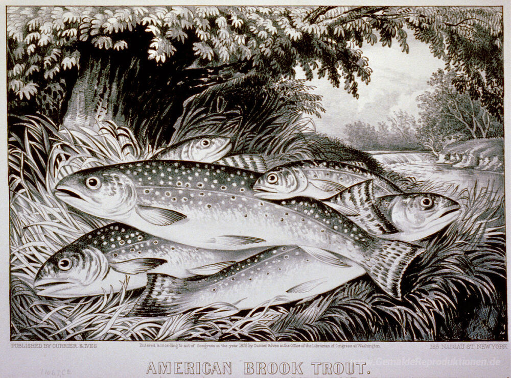 Wir bieten Ihnen eine handgefertigte Reproduktion auf Leinwand des berühmten Kunstwerks 'Amerikanische Bachsaibling' von Currier and Ives, aus dem Reproduktionsmuseum.