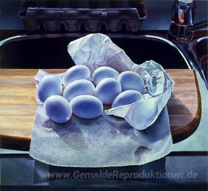 Wir bieten Ihnen eine handgefertigte Reproduktion auf Leinwand des berühmten Kunstwerks 'Ausgehöhlte Eier für Ostern' von Mary Pratt, aus dem Reproduktionsmuseum.