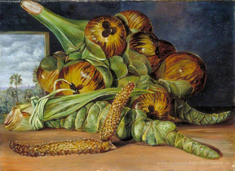 Wir bieten Ihnen eine handgefertigte Reproduktion auf Leinwand des berühmten Kunstwerks 'Blumen und Früchte des Palmyra, und der Palm durch ein Fenster, ' von Marianne North, aus dem Reproduktionsmuseum.