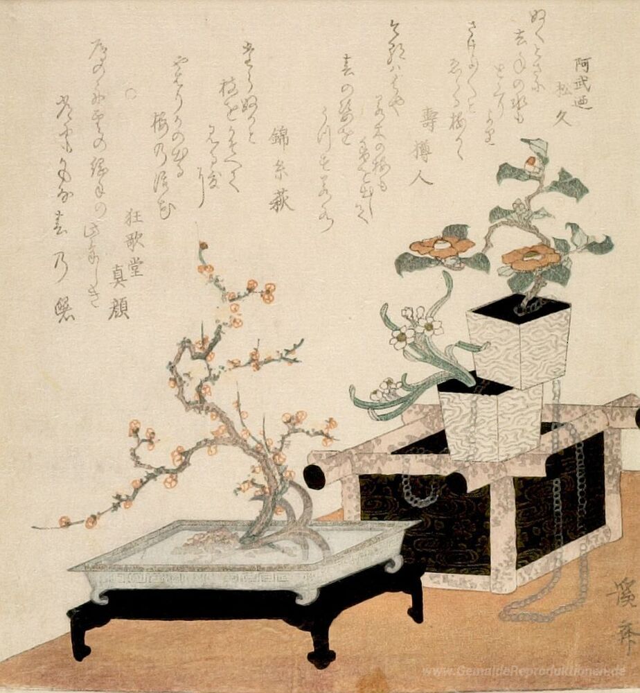 Wir bieten Ihnen eine handgefertigte Reproduktion auf Leinwand des berühmten Kunstwerks 'Blume-Vorbereitungen' von Keisai Eisen, aus dem Reproduktionsmuseum.