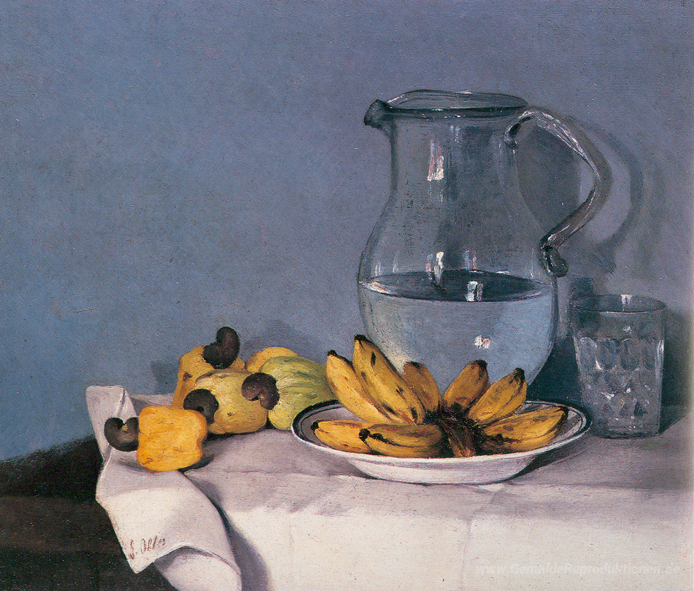 Wir bieten Ihnen eine handgefertigte Reproduktion auf Leinwand des berühmten Kunstwerks 'Bodegón de Guineos, jarra y pajuiles' von Francisco Oller, aus dem Reproduktionsmuseum.