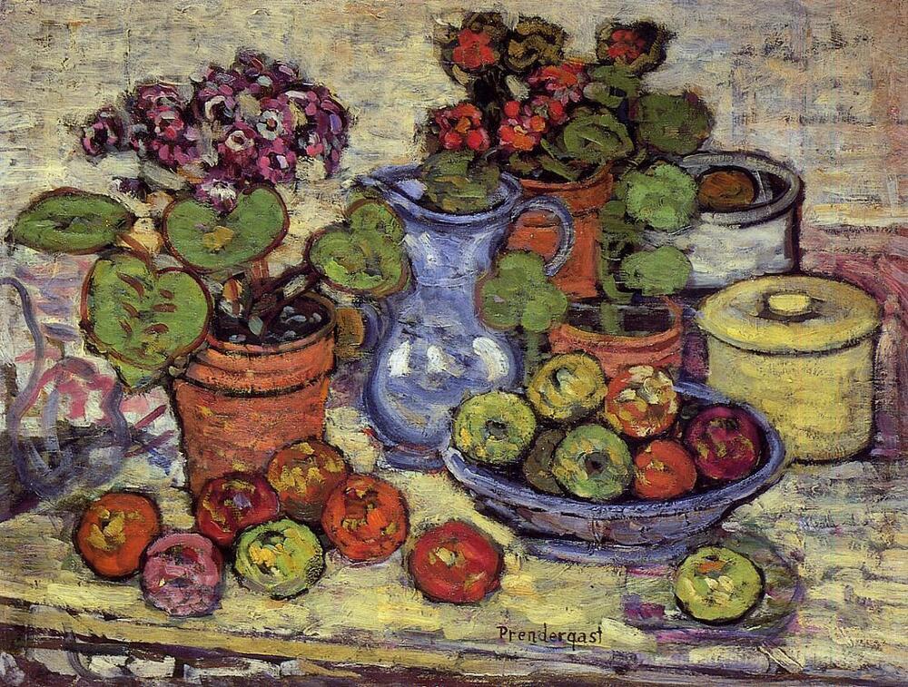 Wir bieten Ihnen eine handgefertigte Reproduktion auf Leinwand des berühmten Kunstwerks 'Cinerarias und Obst' von Maurice Prendergast, aus dem Reproduktionsmuseum.