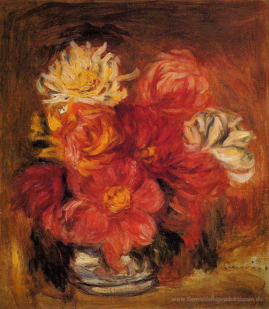 Wir bieten Ihnen eine handgefertigte Reproduktion auf Leinwand des berühmten Kunstwerks 'Dahlien' von Pierre-Auguste Renoir, aus dem Reproduktionsmuseum.