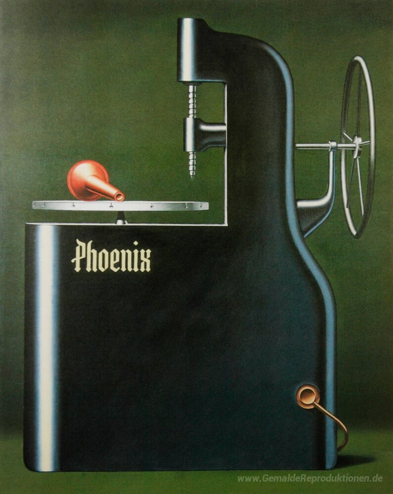 Wir bieten Ihnen eine handgefertigte Reproduktion auf Leinwand des berühmten Kunstwerks 'Das Opfer' von Konrad Klapheck, aus dem Reproduktionsmuseum.