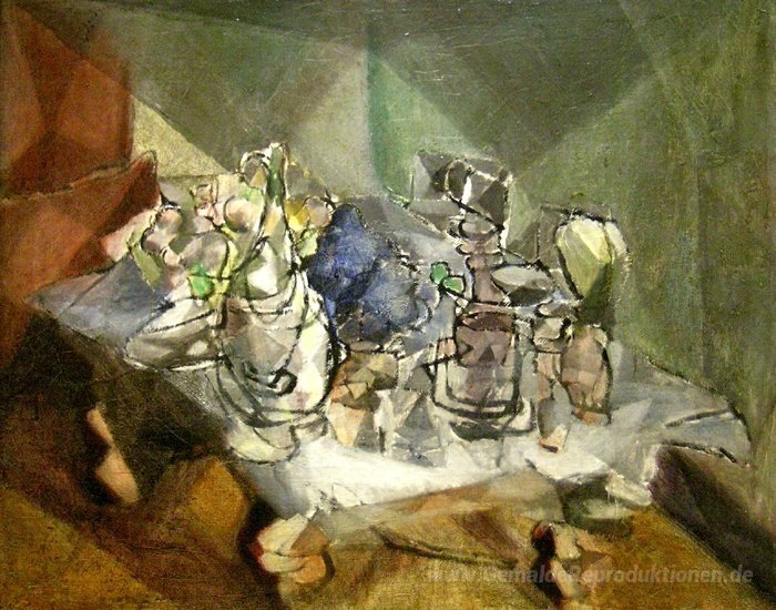 Wir bieten Ihnen eine handgefertigte Reproduktion auf Leinwand des berühmten Kunstwerks 'Der Esstisch' von Jacques Villon, aus dem Reproduktionsmuseum.