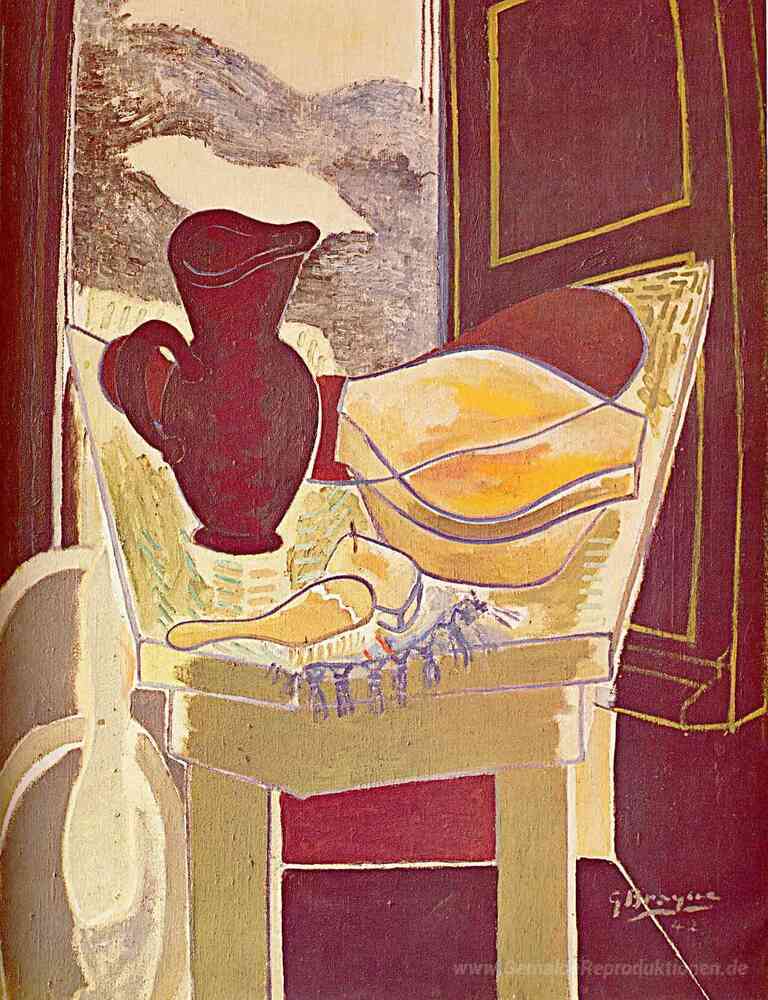 Wir bieten Ihnen eine handgefertigte Reproduktion auf Leinwand des berühmten Kunstwerks 'Der Waschtisch' von Georges Braque, aus dem Reproduktionsmuseum.