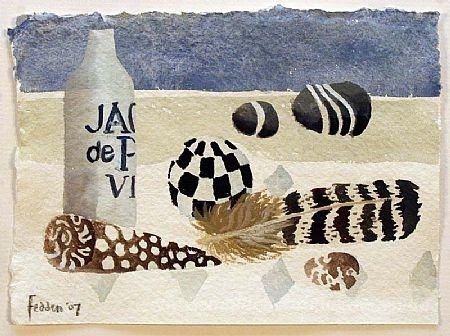 Wir bieten Ihnen eine handgefertigte Reproduktion auf Leinwand des berühmten Kunstwerks 'Federn und Muscheln' von Mary Fedden, aus dem Reproduktionsmuseum.