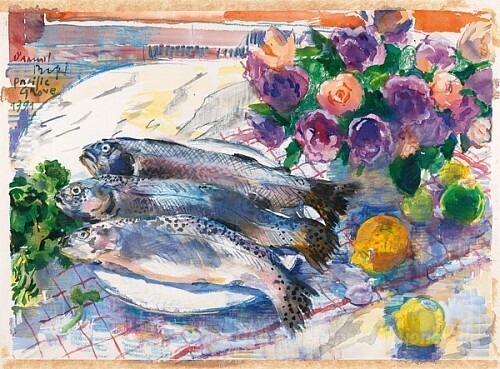 Wir bieten Ihnen eine handgefertigte Reproduktion auf Leinwand des berühmten Kunstwerks 'Fisch, Blumen und Früchte' von Samuel Buri, aus dem Reproduktionsmuseum.