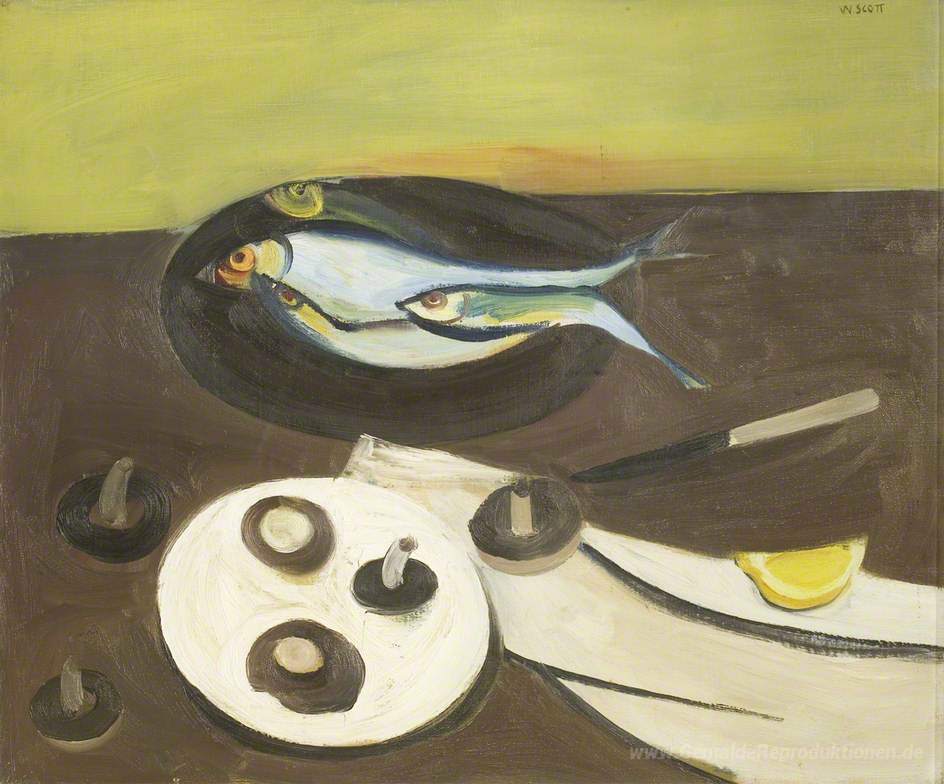 Wir bieten Ihnen eine handgefertigte Reproduktion auf Leinwand des berühmten Kunstwerks 'Fisch, Pilze, Messer und Zitronen' von William Scott, aus dem Reproduktionsmuseum.