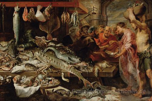 Wir bieten Ihnen eine handgefertigte Reproduktion auf Leinwand des berühmten Kunstwerks 'Fischmarkt' von Frans Snyders, aus dem Reproduktionsmuseum.