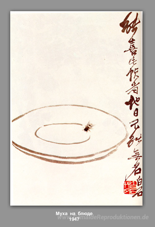 Wir bieten Ihnen eine handgefertigte Reproduktion auf Leinwand des berühmten Kunstwerks 'Fliegen auf einem Teller' von Qi Baishi, aus dem Reproduktionsmuseum.