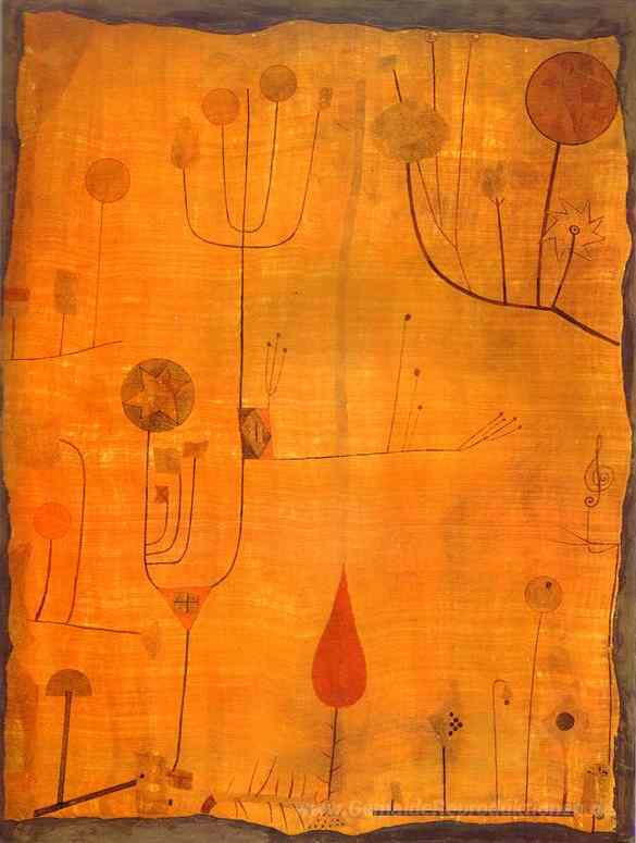 Wir bieten Ihnen eine handgefertigte Reproduktion auf Leinwand des berühmten Kunstwerks 'Früchte auf Rot' von Paul Klee, aus dem Reproduktionsmuseum.