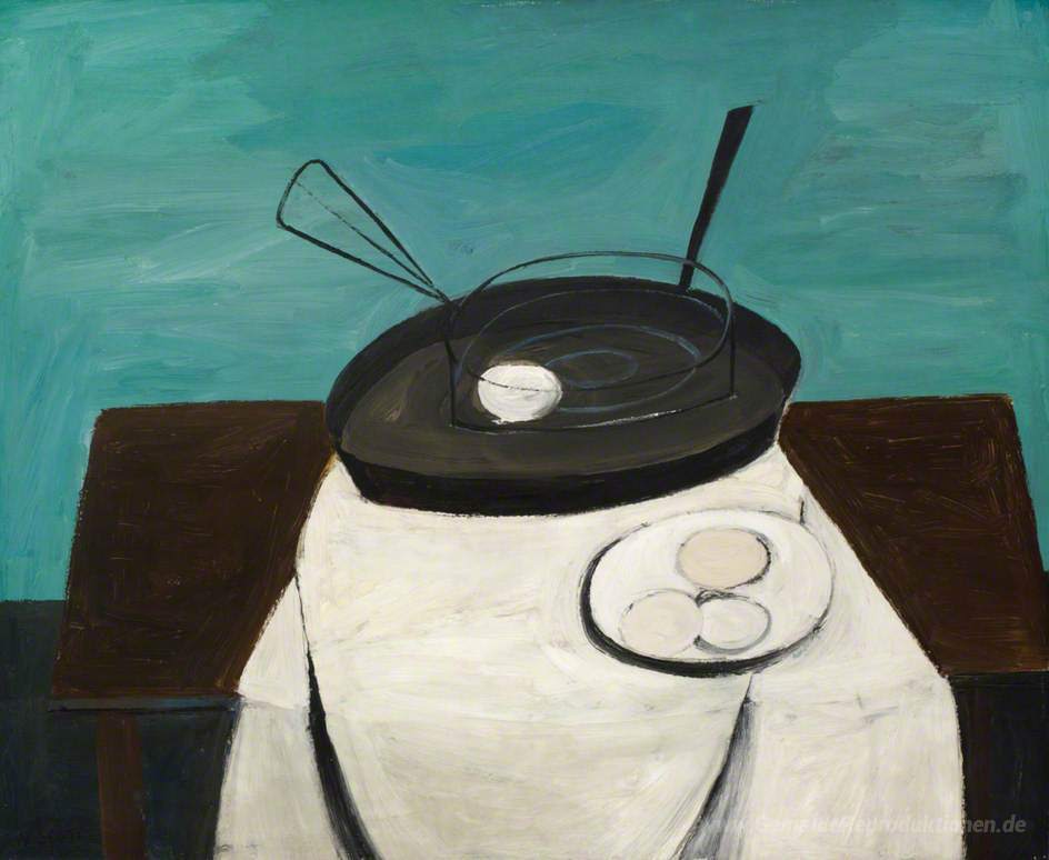 Wir bieten Ihnen eine handgefertigte Reproduktion auf Leinwand des berühmten Kunstwerks 'Frying Pan und Korb' von William Scott, aus dem Reproduktionsmuseum.