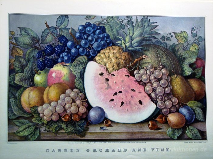 Wir bieten Ihnen eine handgefertigte Reproduktion auf Leinwand des berühmten Kunstwerks 'Garten Obstgarten und Weinstock' von Currier and Ives, aus dem Reproduktionsmuseum.