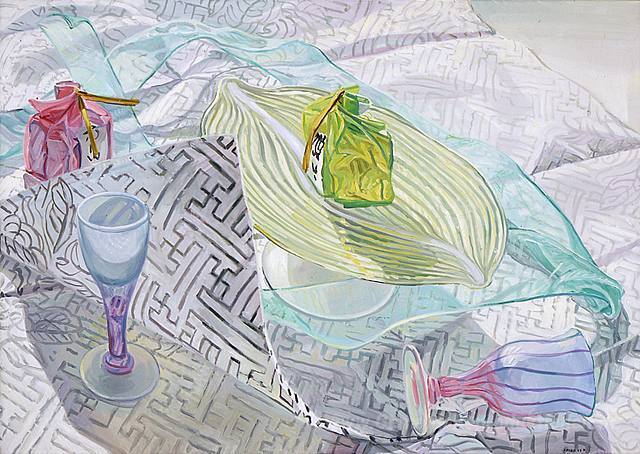 Wir bieten Ihnen eine handgefertigte Reproduktion auf Leinwand des berühmten Kunstwerks 'Gerichte aus Japan' von Janet Fish, aus dem Reproduktionsmuseum.